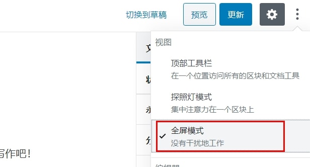 在WordPress 5.4版本更新后,为古腾堡编辑器默认采用了全屏的编辑模式,很多朋友可能并不习惯使用全屏模式来写作,那么如何关闭全屏模式呢?