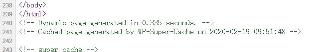 如果不确定自己的站点是否配置成功,你可以退出登陆或者用隐身模式访问自己网站,按 Ctrl + U 查看源代码,拉到页面最底部,看是否有 Cached page generated by WP-Super-Cache 字样,如果有的话,就说明缓存成功