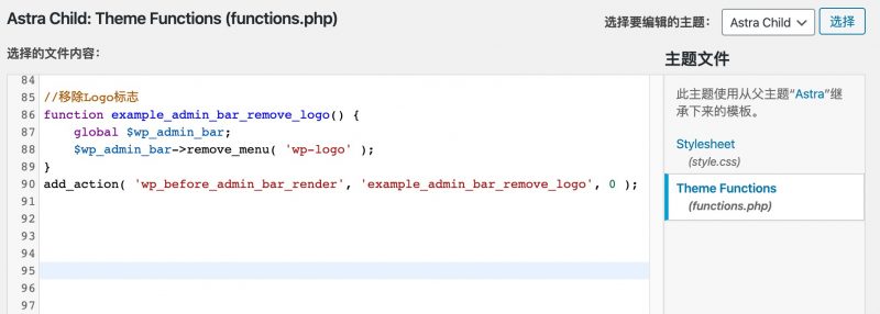 add_action( 'wp_before_admin_bar_render', 'example_admin_bar_remove_logo', 0 );为了能够一直保存代码,建议使用WordPress子主题,并为代码添加注释