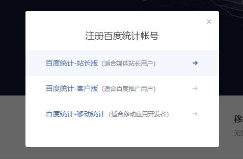 首先我们打开 https://tongji.baidu.com/,注册一个账号,注意这个并不是你的百度账号,需要单独注册,类型选择站长版