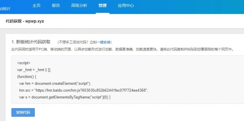 提交域名后,我们就会得到一段Javascript统计代码,接下来我们需要做的就是把这段统计代码安装到WordPress中,点击按钮复制代码