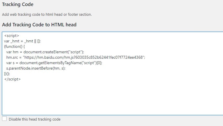 插件装好后,选择 设置 – Tracking Code,把代码粘贴到上边的Head文本框里面并保存