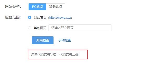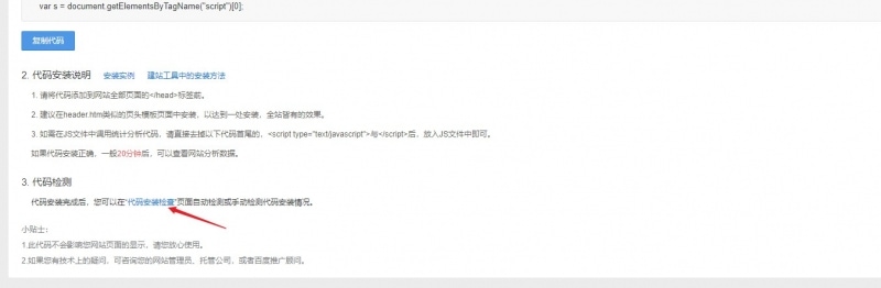 回到百度统计中,在第3步中,有一个代码安装检查的按钮,点击它