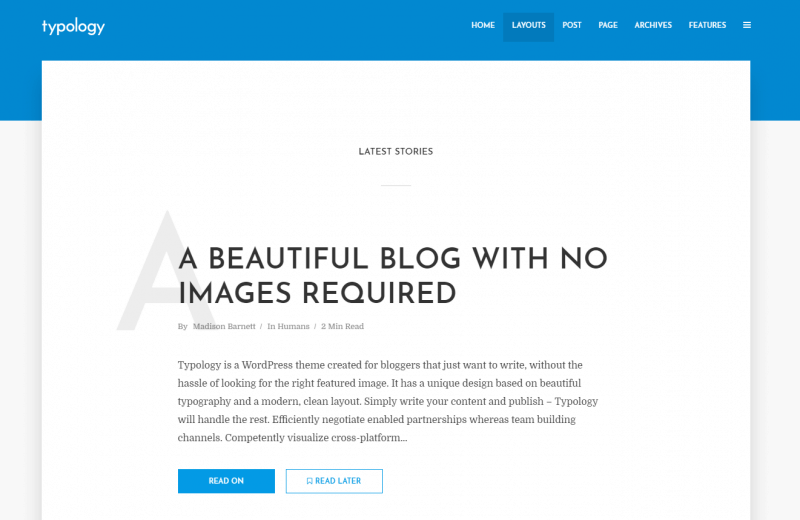 Typology 是一款以文字为基础的主题,这款主题最大的亮点就是它可以不需要任何图片,默认会自动提取标题的文字做成背景。使用这款主题,即使你不使用任何图片,也能做出很漂亮的博客,Typology 还有单栏布局、时间轴列表等,非常适合用来写博客