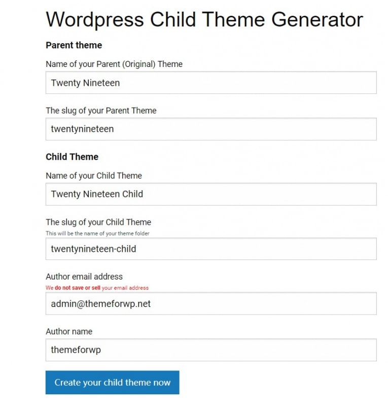 如果主题作者并未提供子主题,在这里我们为大家介绍一个子主题生成网站 Child Theme Generator