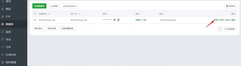 选择数据库 – 找到对应的网站 – 管理,然后你就会自动进入到phpmyadmin了