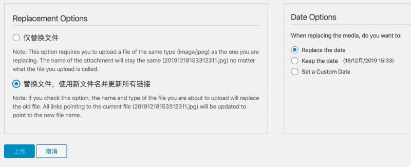 安装好插件后,我们会在图片管理区看到一个新增的替换媒体功能,在替换的详情页中,我们选择第二项替换文件,并使用新的文件名,这样就达到了修改文件名的目的