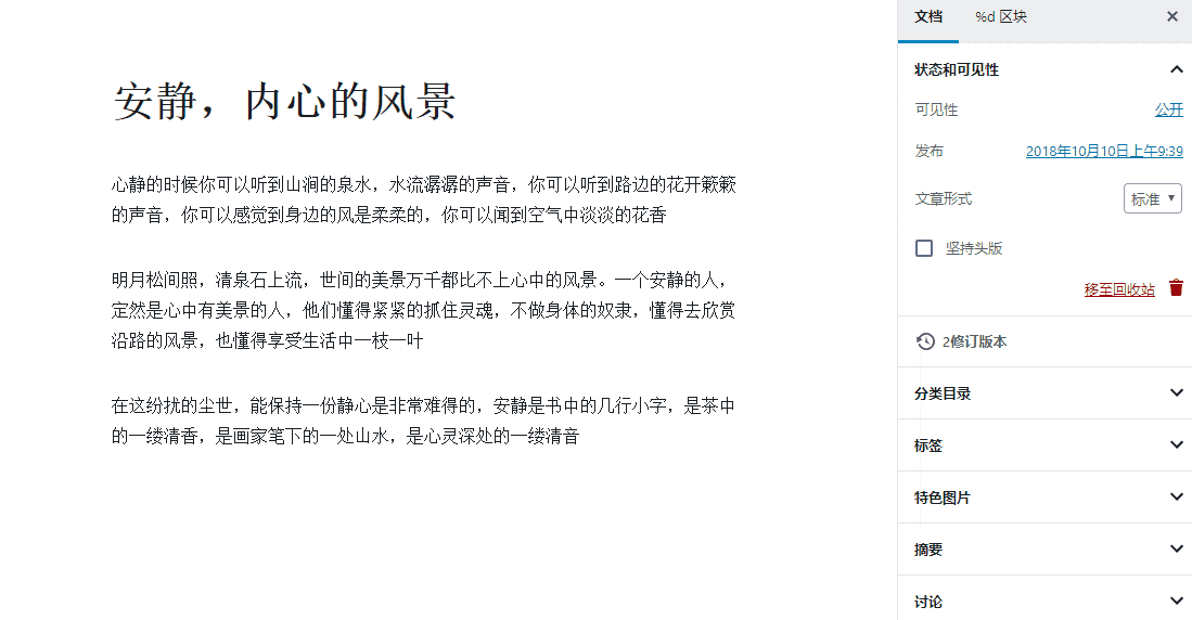 切换古腾堡编辑器后,许多朋友发现WordPress自带的字数统计功能没有了,其实并不是这样,新编辑器只是把它隐藏了,我们点击编辑器顶部的叹号按钮,就会发现字数统计功能,而且除了基本的字数提示功能外,还有一个非常重要的就是文章大纲,可以帮助你更容易的理清文章结构,写出更优秀的内容