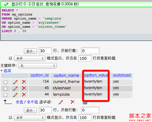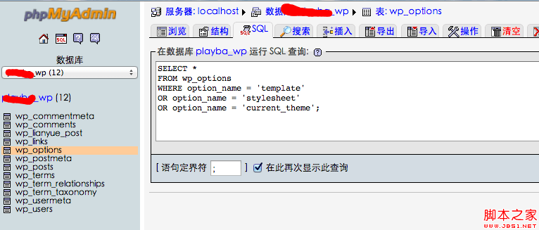 打开phpMyAdmin,选择对应的数据库,在sql文本框中输入一下查询语句,我们就能得到当前的theme